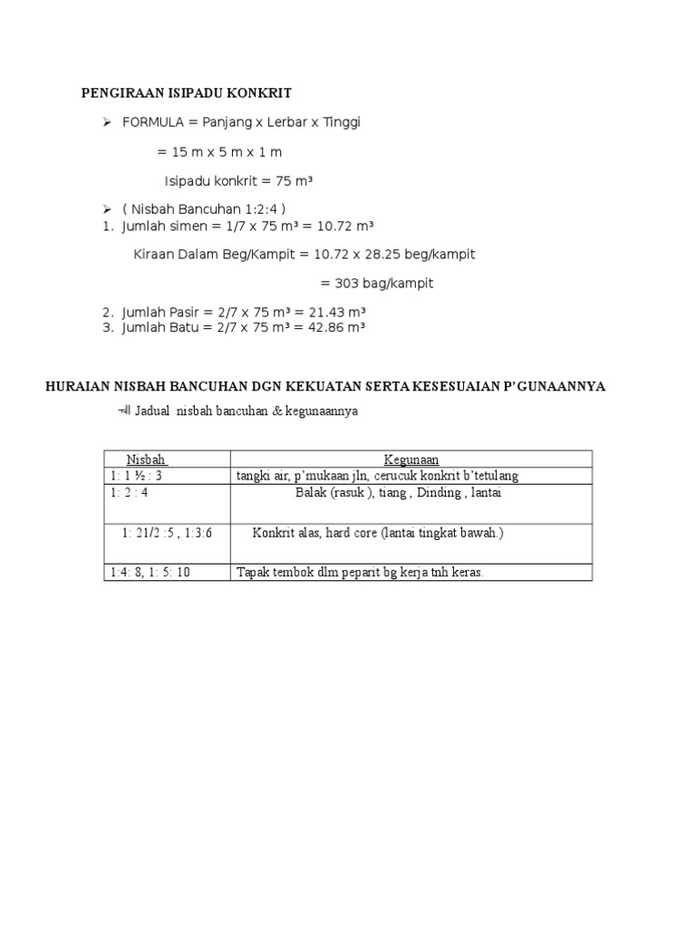 Aijo Pengiraan Isipadu Konkrit Formula Panjang X Lerbar X Tinggi 15 M X 5 M X 1 M Isipadu Konkrit 75 M Nisbah Bancuhan 1 2 4 Jumlah